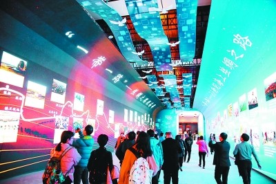 如果你走进国博,可能会感觉到,这个展览,不仅好看,而且好玩。展览中,设置了很多互动环节,吸引人们主动参与。从北区的楼梯拾级而上,看到的是40年来中国人服装的变化,来到二楼,就进入了一个小小的“时光博物馆”,一间旧式客厅瞬间把人拉回到过去的时光,工作人员鼓励观众到皮椅上坐一坐,留下一张穿越时空的照片。更具穿越感的是穹幕影院,这里正在播放4D动画版的《清明上河图》,随着小舟顺流而下,汴河两岸的繁忙景象尽收眼底,星空下升起孔明灯,场景美轮美奂。影院外,观众排起了长队。另一处吸引人们排队的地方是“互动合影”,观众往屏幕前一站,就可以收获一张专属的展览留影,再用手机扫二维码就可以领取。此外,智能画像机器人、各种VR体验区,让观众拥有了多元的观展体验。