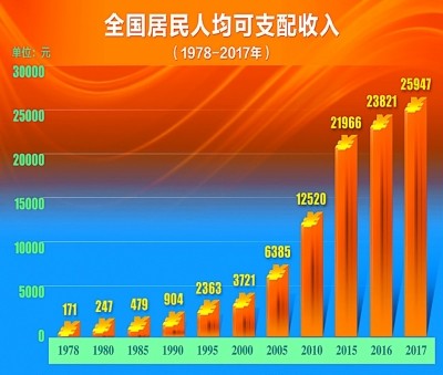 全国居民人均可支配收入从1978年的171元到2017年的25947元,扣除物价因素,实际增长22.8倍。(资料图片)