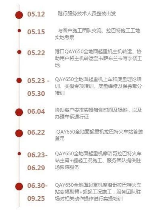 不管是发车前的海外重点产品的专项质量控制、326页理论培训PPT材料准备,还是服务现场的专项理论、实操培训及考试验证,直到最后的证书发放、持续的服务跟踪,摩洛哥QAY650服务团队形成了一整套海外市场超大吨位全地面起重机首装首吊流程,这也为以后超大吨位全地面起重机出口海外市场积攒了丰富的经验。