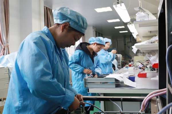 图为万峰公司电装工张艳红和同事一起赶抢任务。刘双群/摄文