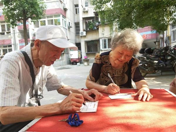 图为老两口党员郭道福和爱人李先荣认真填写卡片。(黄海玲摄文)