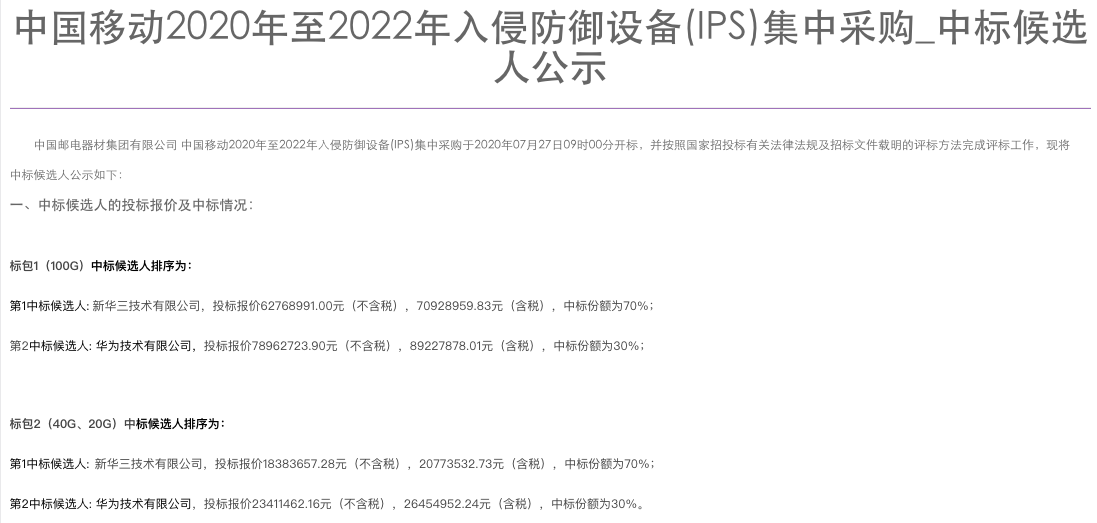 8月27日,中国移动发布2020年至2022年入侵防御设备(IPS)集中采购中标候选人公示,紫光股份旗下新华三集团入围。