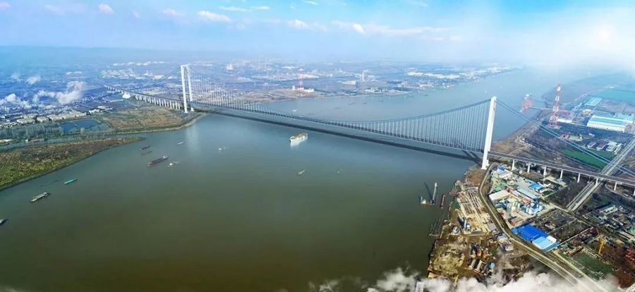 龙潭长江大桥长4963米,主桥采用主跨1560米钢箱梁悬索桥,一跨跨过江面,主跨跨径位居世界前列。其中南锚锭混凝土共21.6万m³,是个不折不扣的“混凝土巨兽”,工程所用混凝土将全部使用三一混凝土机械输送。