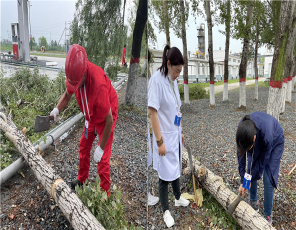服务队不管男女老少,大家知道消息的,主动克服一切困难,积极赶赴现场。5点40分,天然气分公司培训中心院内已经开始紧锣密鼓地清理着地面积水和风雨后满地树枝,大家热火朝天的干着。碗口粗的树倒在水中和地上,经过有关部门允许,这些被风吹倒的树木需要清运出去,可是,没有得心应手的专业电锯,更没有能切割树木的工具,面对大风吹倒碗口粗的大树,大家陷入思考,这要怎么办?没有过多的考虑,一场“人与树”的大战就开始了。“魔术师”王保成“变”出来了斧头还有砍刀,“只能用这些不是专业而又“专业”的切割工具了”,大家用刀和斧头,轮番砍着碗口粗的大树。