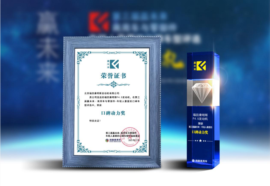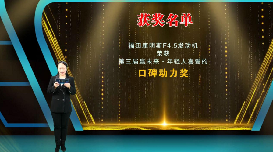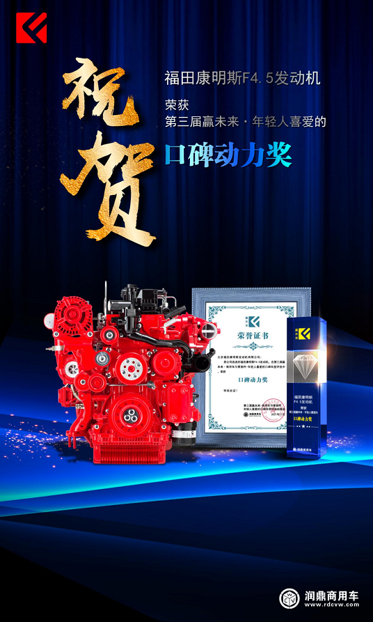 11月30日,由中国快递协会、中国物流学会等多家业内权威机构支持,《润鼎商用车》网主办的“第三届赢未来-商用车与零部件-年轻人喜爱的口碑车型评选”颁奖典礼举办。福田康明斯F4.5发动机荣获“年轻人喜爱的口碑动力奖”。