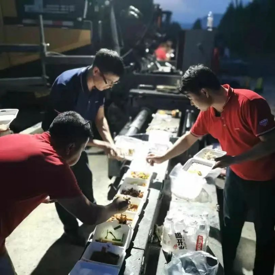 由于工地在山区,交通不方便,为快速完成设备拼装,小组成员无暇晚餐,一直奋战在一线,直到晚上9点左右才吃上饭,简单进餐后,再次投入拼装工作,最终在凌晨12点左右完成车辆安装及调试。
