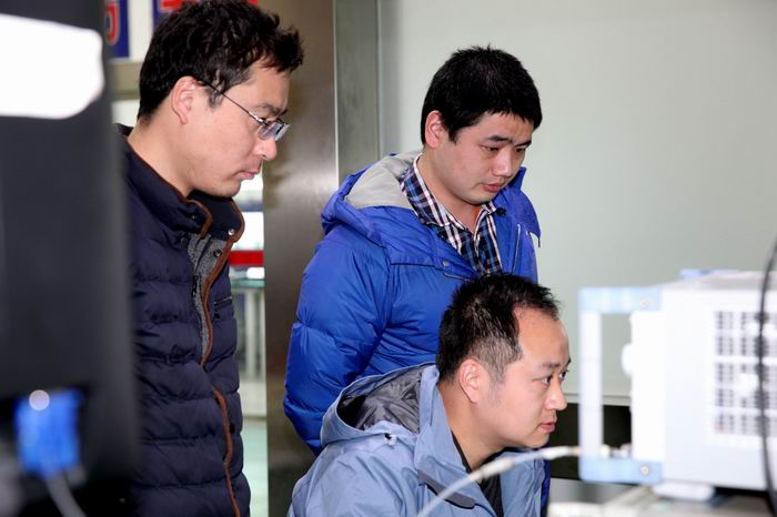3月10日,险峰公司总装厂房,一室设计师沈双正在暗箱前进行某研制产品的测试。仪器上显示出的参数时好时歹,问题不知出在哪里。不一会儿,主管设计师邓伟(左一)、副主任设计师汪郑捷(前排)都来了。三人一起一屏一屏地查看数据、分析图表,时不时调整一下设备仪表,修改几处程序, 10多个小时后,产品各种测试参数表现一致,三人才返回办公室。(张玉莲图文)