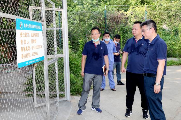 图为7月9日该公司一把手(右)到物资部查看防洪及应急物资储备情况。(张玉莲摄文)