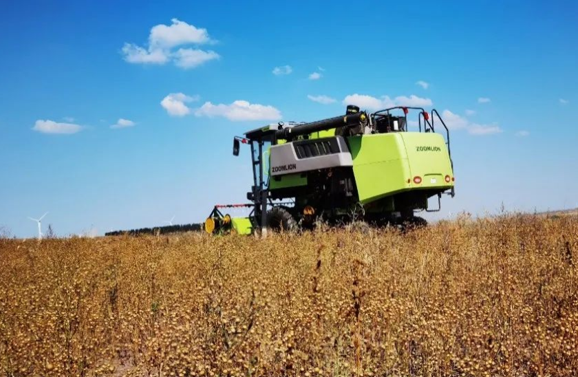 中联重科TE100纵轴流联合收割机进行谷子、胡麻机收作业