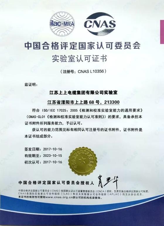 日前,上上电缆实验室获得中国合格评定国家认可委员会实验室认可证书,这标志着上上电缆实验室的综合检验检测能力已达到国内一流、国际先进水平。