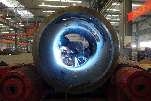 图为焊接工人焊接订单任务110吨矿用车后轿壳。应福根摄文