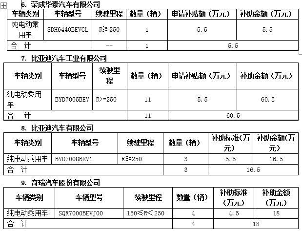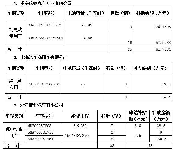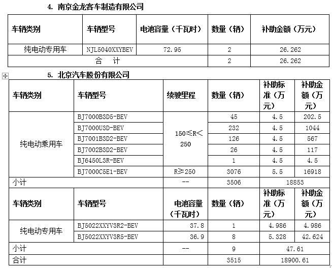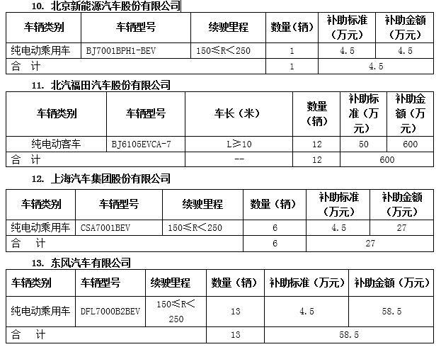 其中北汽集团(北汽股份、北汽新能源、北汽福田)共计申领补贴1.95亿元,比亚迪申领补贴77万元,上汽申领补贴13.5万元,吉利申领补贴178万元,奇瑞申领补贴18万元,东风汽车申领补贴58.5万元。