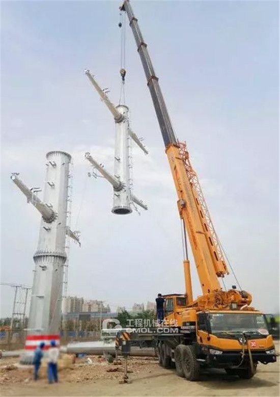 大连长兴岛国电电塔工程的现场,XCT80汽车起重机直戳云霄,不费吹灰之力吊起巨型电塔