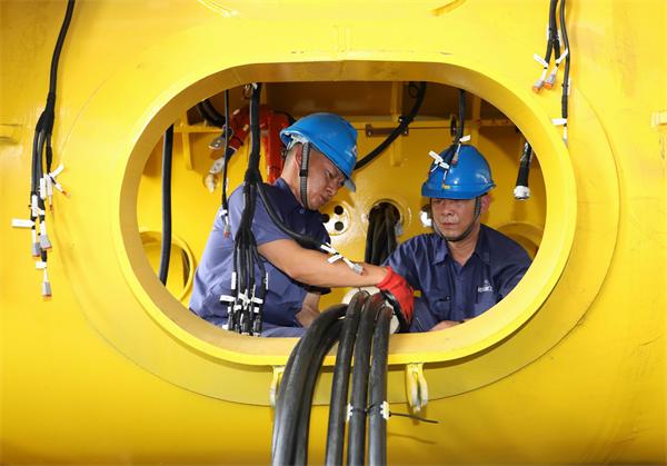 图为“兄弟俩”在363吨超级卡车后桥壳中接线。 (应福根摄文)