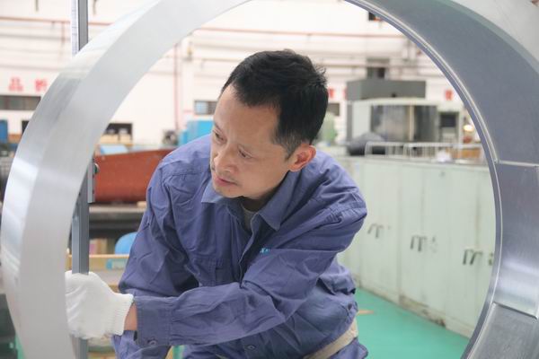 图为加工人员进行加工前的划线准备工作。(万俊显摄文)