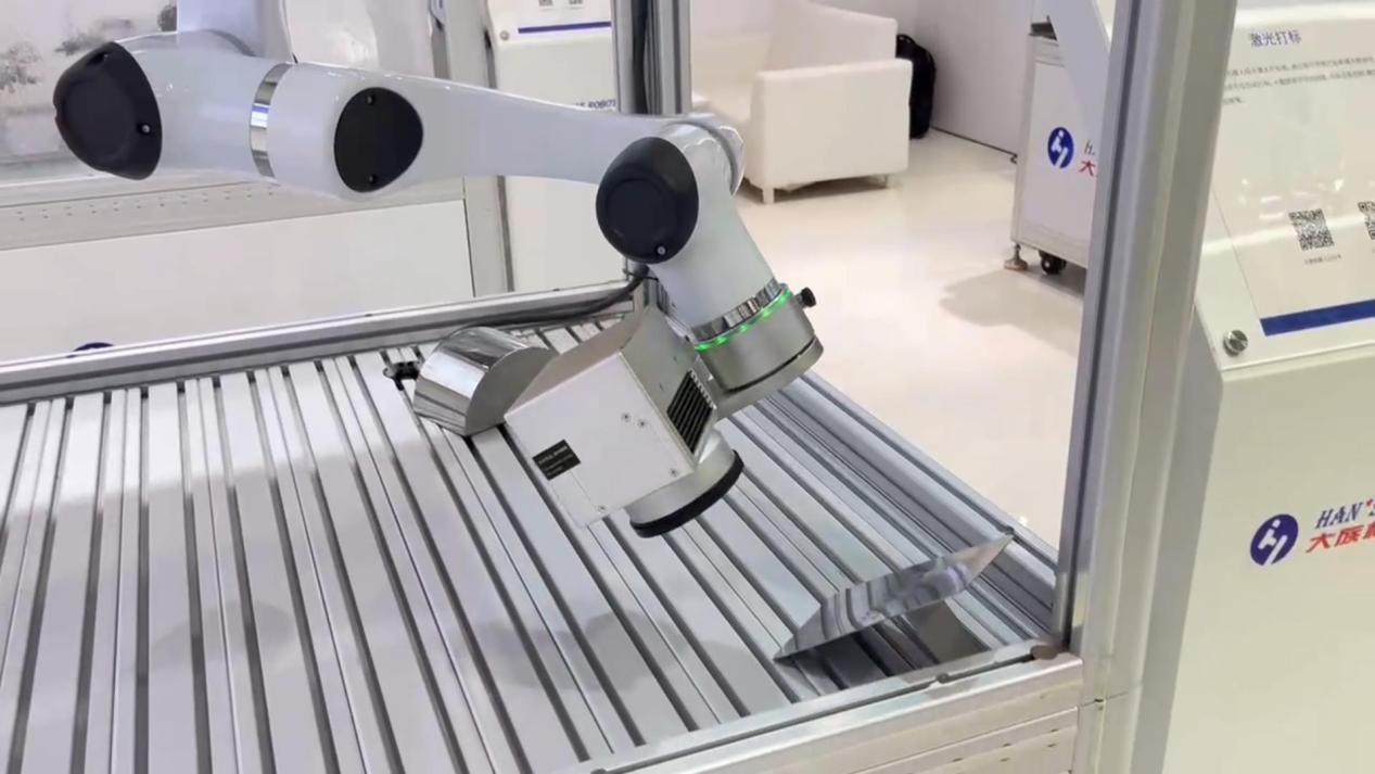 将大族协作机器人结合激光打标机,通过替代传统打标机镜头移动导轨,可实现多方位自动打标,大幅提高空间自由度,可标记条形码、数字、字符、图案等。