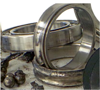 图3 对损坏的摩擦滚珠轴承进行目测检查可得出宝贵的启示,人们可以看到摩擦滚珠轴承的外环上的摩擦痕迹以及内环结合面锈坑