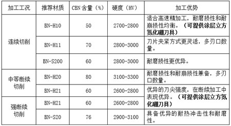 硬态车削齿轮对切削刀具的性能要求较高,传统刀具加工过程中常出现剧烈磨损或崩刀等现象,因此齿轮企业更多的采用进口CBN刀具,对此,华菱超硬经过不断的研发和改善,其PCBN刀具已经覆盖了从连续切削到断续切削等所有加工方式,在硬态车削齿轮领域打破了进口CBN刀具的垄断局面。以下表格就是华菱超硬针对不同加工工况所研发出的刀具材质及其优势。