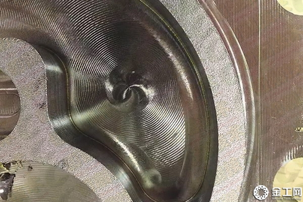 图3 型腔中心显示螺旋坡铣的终止位置以及螺线铣的开始位置,当铣刀进入较窄的区域时开始摆线铣削