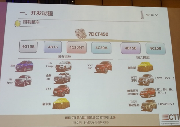据了解,自2014年4月7DCT450项目开发启动到2017年4月成功量产投放市场,仅用了短短的三年时间。郑立朋表示,7DCT450除了达到最优的产品质量,还具有适合整车所有平台的紧凑设计,满足了高产量的需求,在零部件、软件及标定、生产设备具有优秀的供应商系统,已具备批量的自制能力。“7DCT450目前我们做了相应的四款发动机车型的搭载,应用在欧五的工况,未来我们还会做符合欧六的排放,其中的设计从搭载H2车型到VV7、H7等车型实现了全覆盖。”