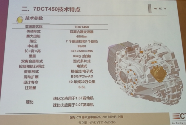 盖世汽车记者在日前举行的CTI中国论坛上了解到,首款中国自主研发和生产7速双离合变速器7DCT450已由长城汽车研制开发成功。长城汽车传动研究院副院长兼项目总监郑立朋分别从开发过程、7DCT450技术特点、工程能力和试验情况对该产品进行了详细的介绍。
