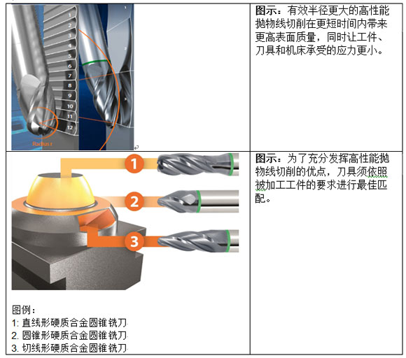 现代化的CAD/CAM系统能创建极为复杂的铣削程序。以高性能抛物线切削工艺为例,它能通过大的步距在精加工中得到更为光滑的外表面,整个过程耗时极短。高性能抛物线切削工艺是对球头铣刀的进一步开发,这也是一个相对较新的领域,又被称为圆锥铣刀。要进行高性能抛物线切削的前提是需要最新的5轴铣床和CAD/CAM软件,后者可以数据模型的形式对刀具外形进行处理,从而辅助整个高性能抛物线切削流程。
