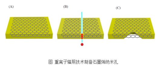 科研人员把大面积石墨烯转移至PET膜上形成G/PET复合结构(图A),然后利用兰州重离子加速器提供的高能重离子对G/PET复合结构进行辐照,形成石墨烯纳米孔并在PET中形成潜径迹(图B);再利用非对称蚀法在PET中制备出锥形孔并形成具有微孔支撑的石墨烯纳米孔(图C)。该方法充分发挥了兰州重离子加速器离子能量高、穿透能力强的特点,可方便、快速地制备出具有微孔支撑的大面积、孔密度可控的多孔石墨烯,获得了授权发明专利。