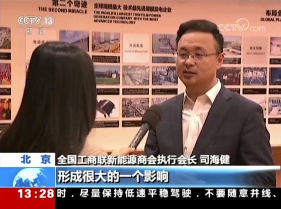 1月27日,央视新闻频道《新闻直播间》以“关注新能源汽车 北京新能源小客车申请井喷式增长”为题报道了北京新能源汽车发展情况,并采访了全国工商联新能源商会执行会长、中国薄膜光伏产业联盟主席、汉能薄膜发电集团执行董事、首席执行官司海健先生。司海健在采访时表示,日趋成熟的政策把控、全民环保意识的提高,以及薄膜太阳能技术的进步,这些将对未来清洁能源汽车的发展产生重大影响。