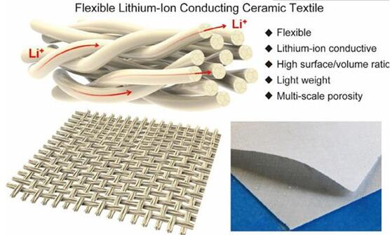 锂离子导电陶瓷织物是一款柔性材料,保留了原始模板(original template)的物理特性。该款陶瓷织物的结构独特,可凭借连续纤及连续玻璃纤维原纱(continuous fibers and yarns)、固态导体的高表面面积/体积比、多级孔隙分布来实现锂离子长距传递途径。