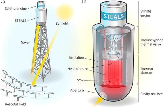 定日镜首先将阳光反射到STEALS底部的相变材料(PCM),而与PCM连接的钠热管会将热量输送到各个系统中,热管顶部也会与热虹吸管的蒸发器连接。其中液态钠蒸发后会输送到史特林发动机中,并在发动机上方凝结,之后液态钠会再回流至蒸发器。为调节电力输出,调整阀门开关可控制钠流量与从储热器到动力区块的热量。