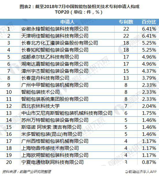 截至2018年7月,我国智能包装相关专利申请人前20位详见下表: