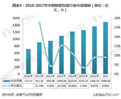 2016年我国智能包装的市场规模达到1366.53亿元,2017年达到1488.09亿元,同比增长8.90%;目前智能包装细分市场规模最大的为RFID市场,2017年RFID市场规模已达到752.4亿元;前瞻预计未来几年,我国智能包装行业市场规模仍将保持较快的增长速度。