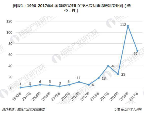 1990-2010年,每年我国智能包装相关专利申请数量维持在10件以下;2011年以来,总体呈现快速增长的态势;2016年智能包装相关专利申请数量达到最大值为112件,为历年来的最大值;2017年的智能包装相关专利的申请数量下降为67件。