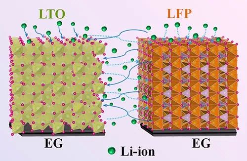 最近,该研究团队率先开发出一种全固态平面集成化的锂离子微型电池。该锂离子微型电池以纳米钛酸锂纳米球为负极,磷酸铁锂微米球为正极,高导电石墨烯为非金属集流体,离子凝胶为电解液,具有平面十指交叉构型且无需使用传统隔膜和金属集流体。获得的锂离子微型电池具有多方向传质的优势,表现出高体积能量密度125.5mWh/cm3,优异的倍率性能;超长的循环稳定性,3300次循环后容量基本没有衰减;以及良好的机械柔性,在反复弯曲或扭曲下其电极结构无损坏以及电化学性能无明显变化。同时,该微型储能器件能在100°C的高温环境下稳定工作且具有长循环稳定性(1000次循环)。此外,该锂离子电池无需金属连接体便能实现模块化自集成,实现输出电压和容量的有效调控。因此,该锂离子微型电池在柔性化、微型化电子器件的应用中具有很大潜力。