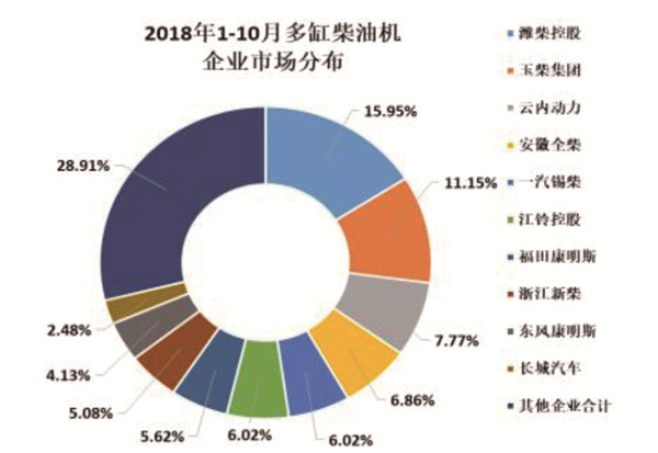 用于商用车29家配套的多缸柴油机占比达62.77%,受商用车销售回落影响环比持平同比下降。潍柴商用车内燃机市场占有率始终领先。10月,多缸柴油机销量21.04万台,环比增长0.13%,同比下降16.24%;前10月销量225.96万台,同比下降4.89%,。销量前十的企业为潍柴、玉柴、江铃、福康、云内、锡柴、东康、全柴、重汽本部、杭发,前十名销量占总销量79.26%;市场份额依次为潍柴17.98%、玉柴12.26、江铃9.59%、福康8.95%、云内8.69%、锡柴7.23%、东康4.27%、全柴3.93%、重汽本部3.40%、杭发2.97%。各多缸企业纷纷争夺的客车市场中,玉柴始终保持领先地位。