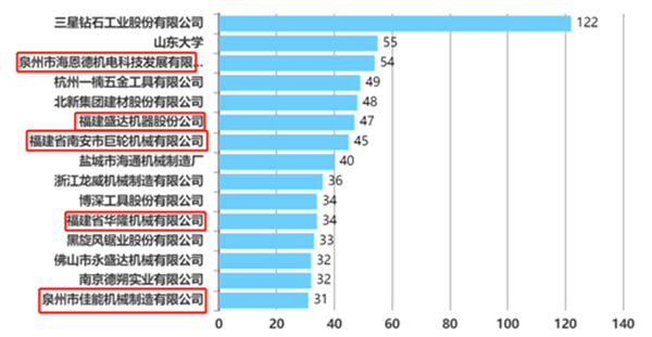 其次,入选中国石材切割装置领域前十五申请人的福建企业有:泉州市海恩德机电科技发展有限公司、福建盛达机器股份公司、福建省南安市巨轮机械有限公司、福建省华隆机械有限公司、泉州市佳能机械制造有限公司。