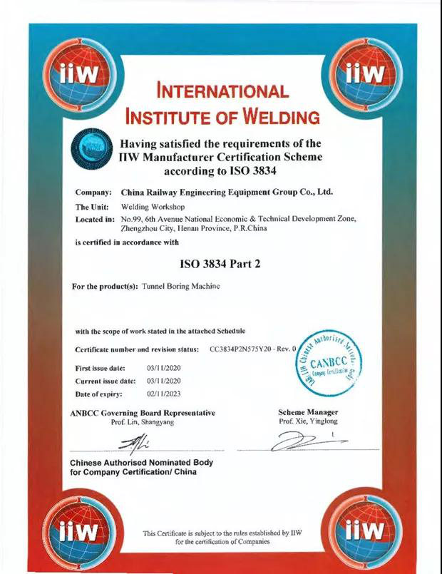 11月5日,从国际焊接学会中国焊接企业资格认证委员会(CANBCC)传来喜讯,中铁装备顺利通过ISO3834-2国际焊接质量体系认证,这是目前世界焊接领域最具权威的认证。
