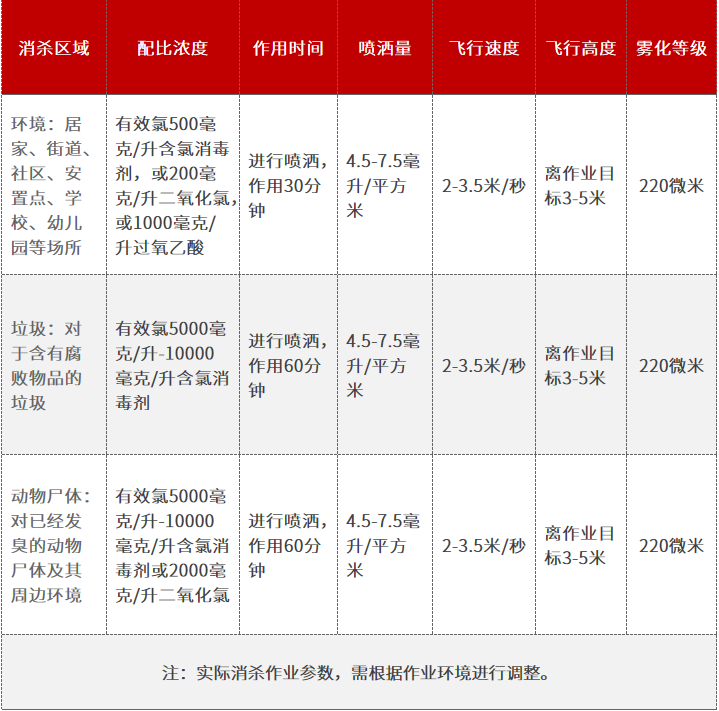 防疫消杀过程主要使用含氯消毒剂或 75% 的医用酒精。建议消毒剂配制方法和无人机喷洒参数如下: