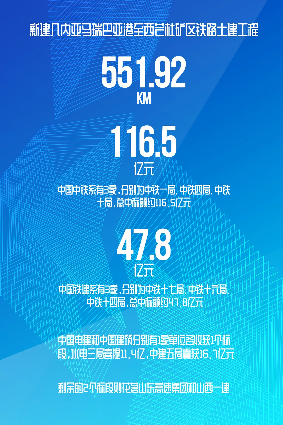 10个土建标分别花落10家建企,其中中国中铁系有3家,分别为中铁一局、中铁四局、中铁十局,总中标额约116.5亿元;中国铁建系有3家,分别为中铁十七局、中铁十六局、中铁十四局,总中标额约47.8亿元;中国电建和中国建筑分别有1家单位各收获1个标段,水电三局喜提11.4亿,中建五局囊获16.7亿元;剩余的2个标段则花落山东高速集团和山西一建。项目累计中标额约 221.6 亿元。其中中铁四局拿下了最大一单:MXSG-8标段,中标额约64亿元。这也使得中国中铁成为该海外铁路工程项目的最大中标赢家。