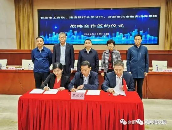 合肥市工商联、建行合肥分行、合肥市兴泰融资担保集团签订战略合作协议,出席会议的领导为10家商协会颁发综合授信牌匾,合肥市工程机械商会会长、合肥湘元工程机械有限公司董事长周驰军先生出席启动仪式,并接受了建行合肥分行、合肥市兴泰融资担保集团颁发的预授信额度2亿元牌匾。