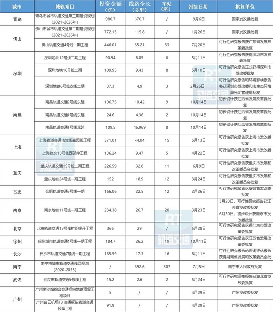 据RT轨道交通统计,截至2021年10月份约4972.55亿元的重大轨道交通项目获批,其中包括国家发改委批复、可行性研究报告批复、初步设计批复等,涉及到的项目约22项。