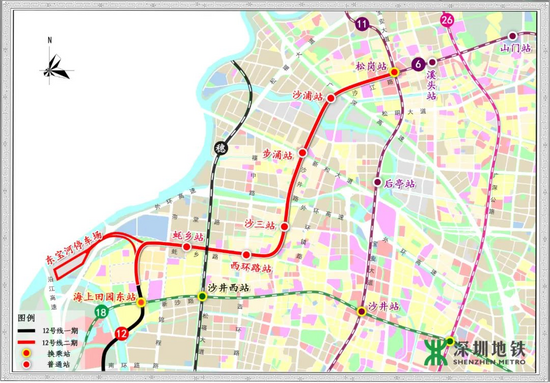 项目概况:12号线二期工程自在建12号线一期线路终点,海上田园东站末端接出,经蚝乡站、西环路站、沙三站、步涌站、沙埔站,终至11号线与6号线换乘站松岗站,共设站6座,线路全长约8.05km,采用全地下敷设方式。