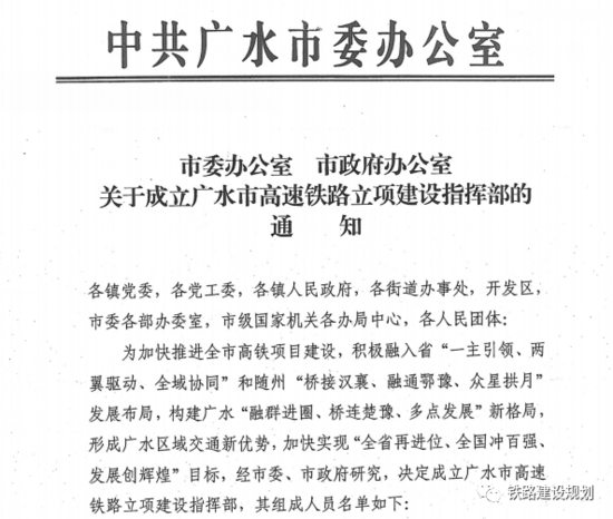 吴军就我市铁路项目建设作了安排部署。会议宣读了《市委办公室、市政府办公室关于成立广水市高速铁路立项建设指挥部的通知》。