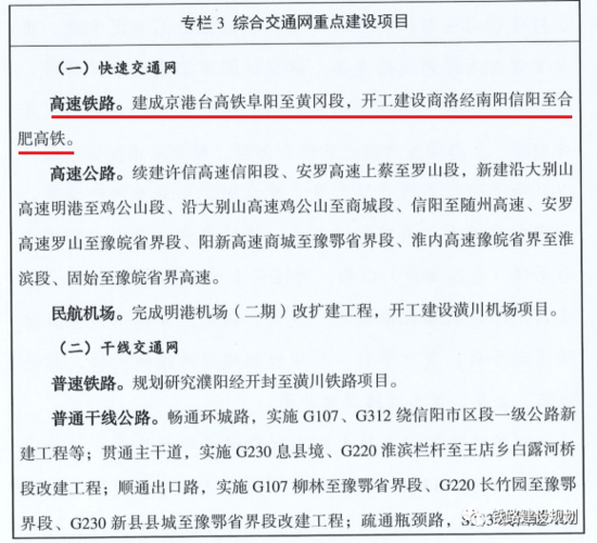 “构建发达高效的快速网。加快布局“两纵一横”快速铁路网,重点实施京港台高铁阜阳至黄冈段、开工建设南阳经信阳至合肥高铁。实施高速公路“145工程”,重点建设许信、安罗、沿大别山等高速公路项目,着力提升高速公路主通道能力、打通省际出口通道、完善中心城市辐射网络。拓展航空服务范围,完成明港机场(二期)改扩建工程,开工建设潢川机场,形成“一市两场”航空布局,超前谋划布局信阳临空经济区和大别山通用航空产业园,助力河南民航机场“强枢增支”工程建设。”