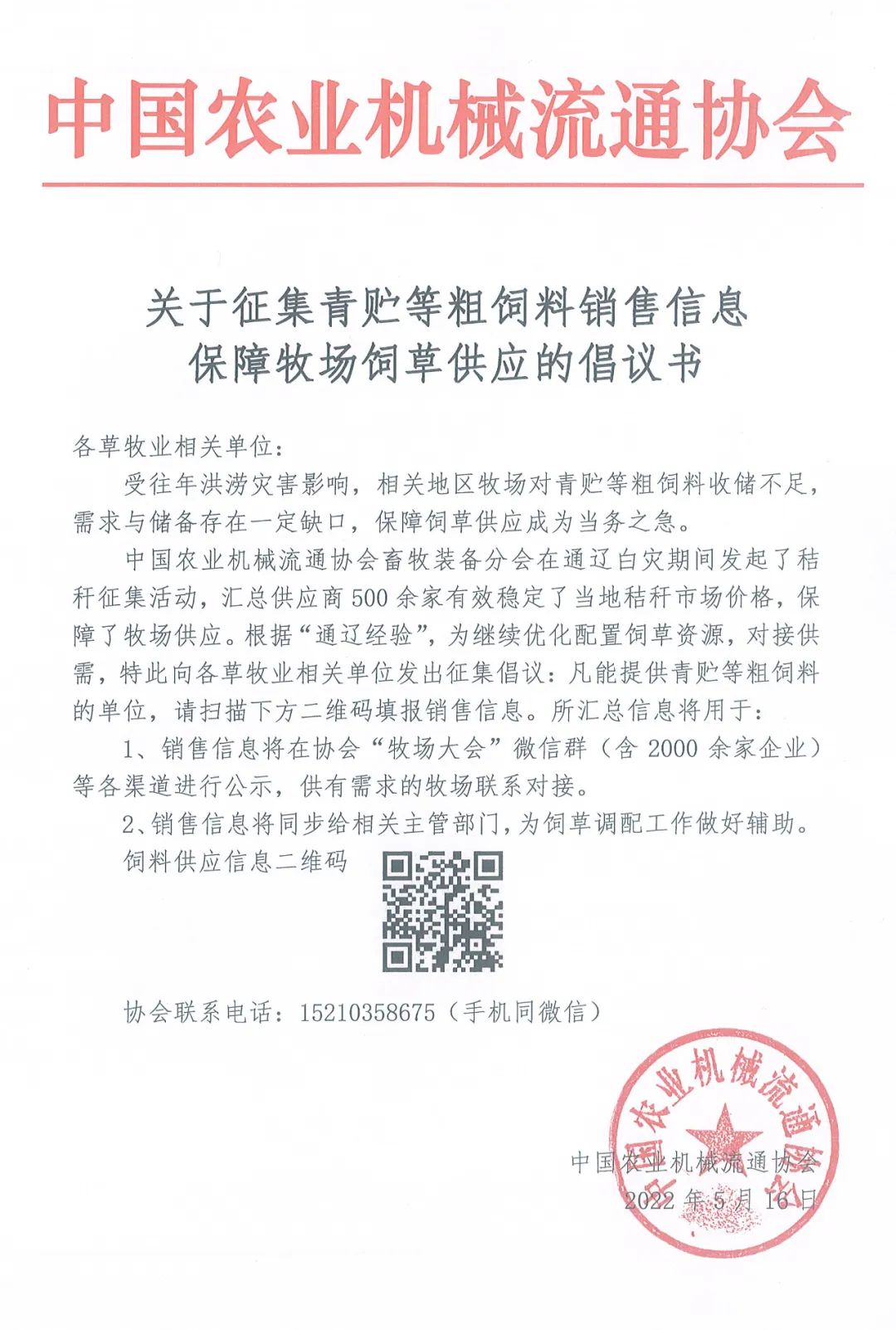 中国农业机械流通协会倡议:征集青贮等粗饲料销售信息 保障牧场饲草供应