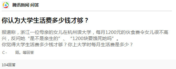 作为一名大学生,一个月一般会花多少钱?围绕大学生消费的相关话题,社会上一直争论不断。在消费方面,大学生作为一个颇显尴尬的群体,有劳动能力却没有固定收入,因此一旦伸手向父母要钱就易被质问,却又无可奈何。而对于那位义乌妈妈“大学生生活费多少钱才够”的问题,企鹅问答的网友们纷纷回忆起了自己的大学生活……
