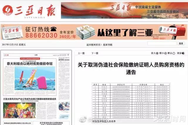 12月15日,海南省三亚市住房和城乡建设局在《三亚日报》上发布《关于取消伪造社会保险缴纳证明人员购房资格的通知》公告,取消14名伪造社会保险缴纳证明人员的购房资格,并公布具体名单,在全国尚属首例。