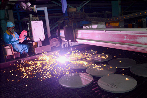 2018年7月26日,占我国不锈钢销售量半壁天下的江苏无锡市,该市锡山大明金属工人用激光切割25mm厚度不锈钢板(杨木军 摄)
