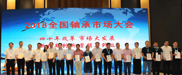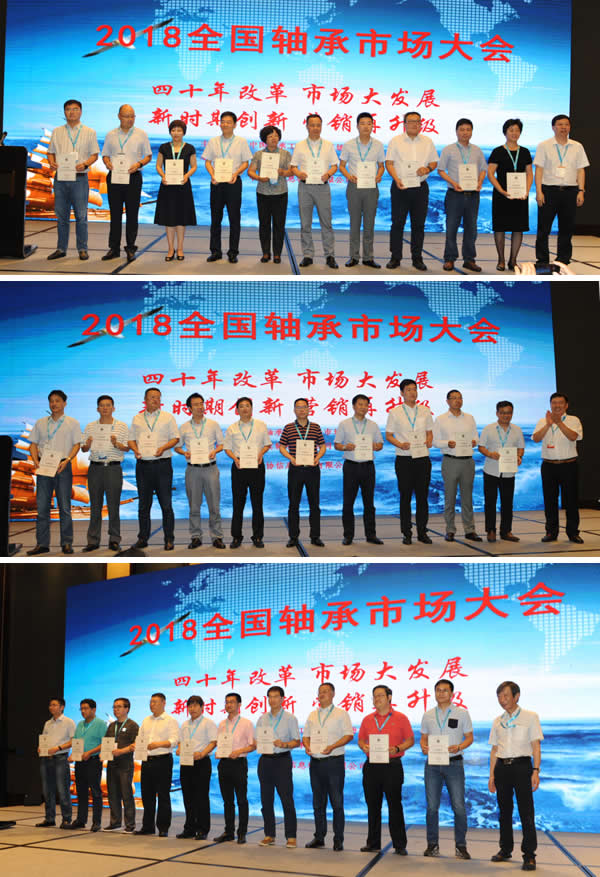 2018 年恰逢国家改革开放 40 周年,中国轴承行业经过 40 年风云激荡,已经发展为近 1800 亿的庞大市场,成为轴承制造大国,在此过程中塑造了一批知名产品品牌与企业品牌,也炼就了一批活跃市场的经销商群体。本次会议一个重要环节是中国轴协首次发布“2017中国轴承市场营销30强”(名单附后)、首次表彰了18个“2017中国轴承优秀经销商”(名单附后)。中国轴协常务副理事长兼秘书长周宇,中国轴协轮值理事长、市场委员会主任、哈尔滨轴承集团公司董事长、党委书记庞军,中国轴协副秘书长牛辉,分别为获奖厂、商代表颁奖并合影留念。这两个奖项的评选和颁发,既是对行业卓越厂、商的肯定,又是一个精神鼓励,激励广大厂商以“轴承强国梦”为己任、以“为用户提供优质产品和服务”为使命,以“厂商共赢”为目的,共谋发展大计。