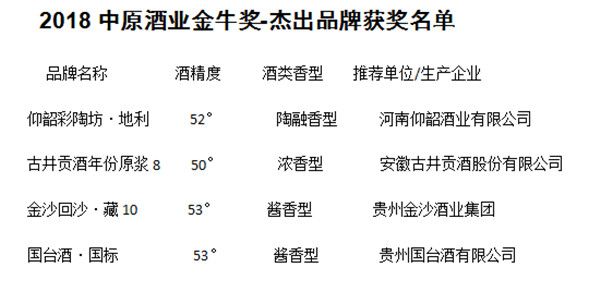 中原酒业金牛奖评选组委会根据2018中原酒业金牛奖评选办法,最终共评选出杰出品牌4个,优秀品牌26个,杰出企业10家,杰出酒商41人,杰出人物13人,卓越人物4人。